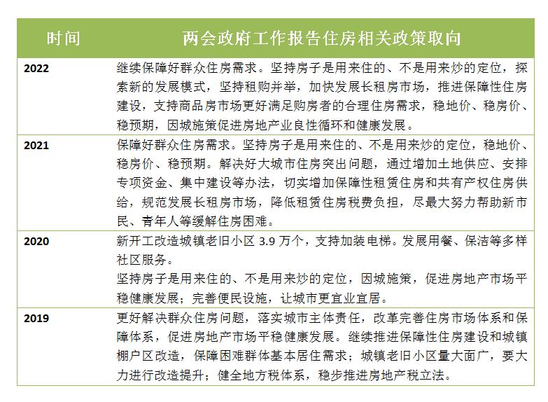对于2022年房地产方面的工作部署,共120余字。工作报告指出,继续保障好群众住房需求。坚持房子是用来住的、不是用来炒的定位,探索新的发展模式,坚持租购并举,加快发展长租房市场,推进保障性住房建设,支持商品房市场更好满足购房者的合理住房需求,稳地价、稳房价、稳预期,因城施策促进房地产业良性循环和健康发展。