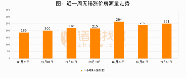 根据诸葛找房数据显示,无锡24小时涨价房源量为251套,较09月05日增加12套,环比上涨5%。与此同时,涨价房源占比小幅扩大,业主信心有所提升。