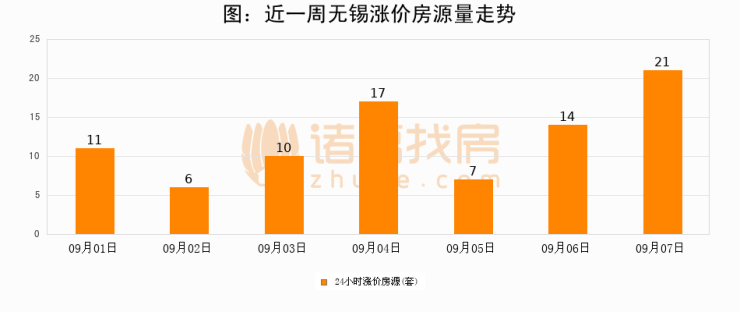 根据诸葛找房数据显示,无锡24小时涨价房源量为21套,较09月06日增加7套,环比上涨50%。与此同时,涨价房源占比小幅扩大,业主信心有所提升。