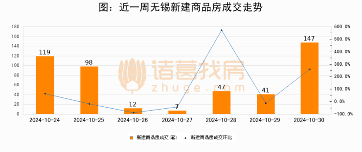 根据无锡市房地产市场管理和监测中心数据显示,2024年10月30日无锡新建商品房成交147套,较昨日增加106套,环比上涨258.5%