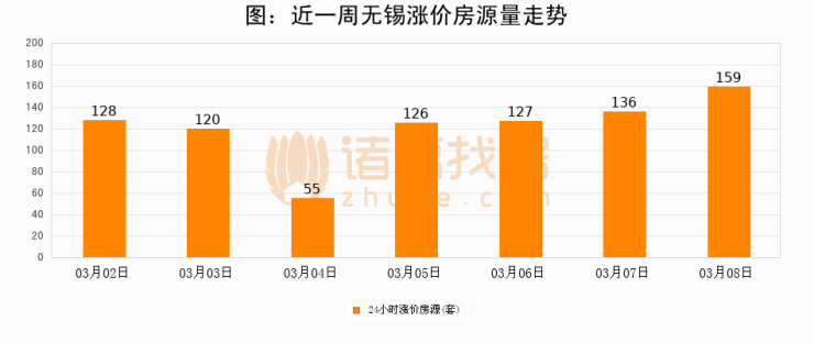 根据诸葛找房数据显示,无锡24小时涨价房源量为159套,较03月07日增加23套,环比上涨16.9%。与此同时,涨价房源占比小幅扩大,业主信心有所提升。