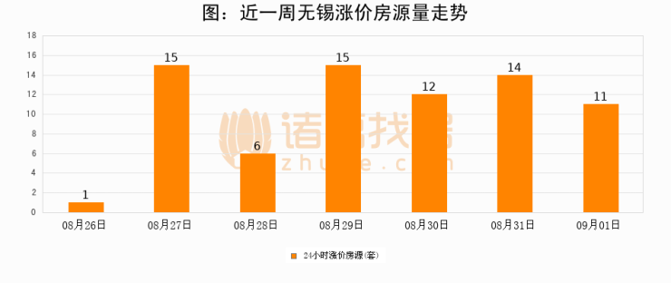 根据诸葛找房数据显示,无锡24小时涨价房源量为11套,较08月31日减少3套,环比下降21.4%。与此同时,涨价房源占比小幅回落,对于购房者来说是一个入市窗口期,购房者可抓住时机入市。